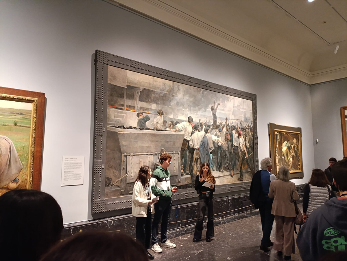 Tras dos horas de paseo por el Madrid histórico, otro grupo de alumnos, que se había preparado minuciosamente, realizó una exposición sobre algunas de las pinturas más relevantes que alberga el Museo del Prado. Se llevó a cabo un repaso bien documentado de obras maestras de la pintura española, como Las Meninas de Velázquez y las Pinturas Negras de Goya; flamenca, con El Descendimiento de Van der Weyden o El Jardín de las Delicias del Bosco; y pinturas del siglo XIX de artistas como Pradilla o Sorolla.